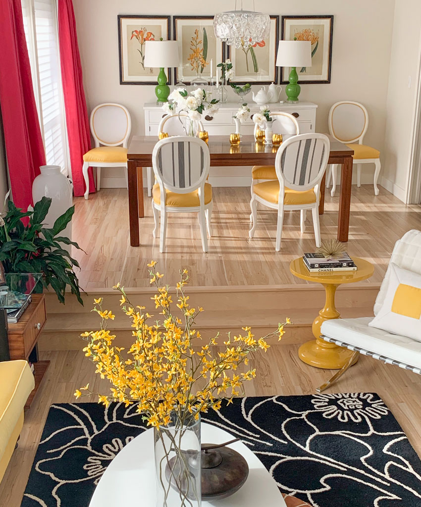 The neutrals in my room were black, white and pale greige, along with wood floors and my wood-stained parsons dining table and end table. In order to make your accent colours look intentional and balanced, you need to follow this simple rule: Repeat each accent colour at least once or twice in small, medium and large doses.